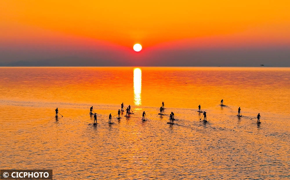 ↑2025年8月24日清晨,桨板爱好者在浙江省湖州市长兴县太湖街道附近的太湖水域进行桨板运动。(无人机照片)CICPHOTO/陈海伟 摄