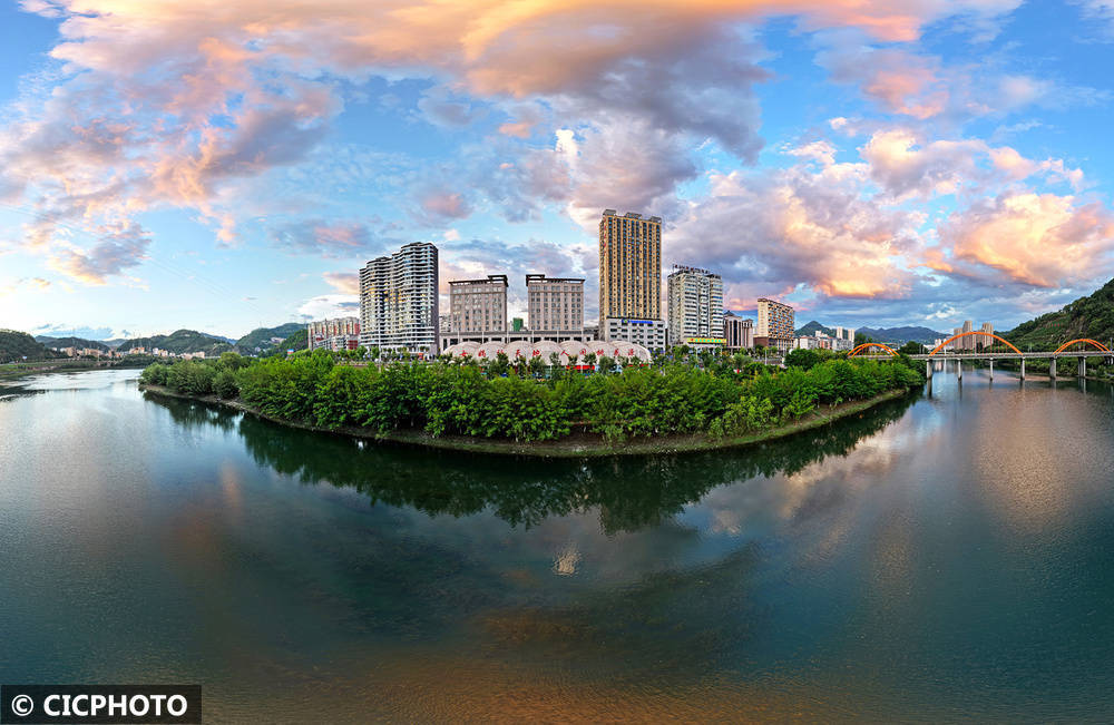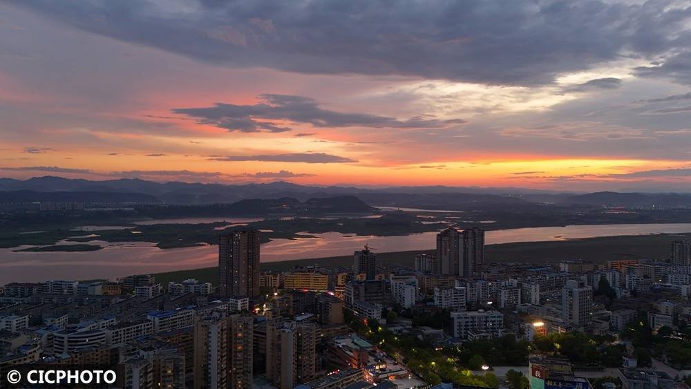 ↑2025年8月20日傍晚在湖北省十堰市郧阳区城关镇拍摄的景色。(无人机照片)CICPHOTO/王涛 摄
