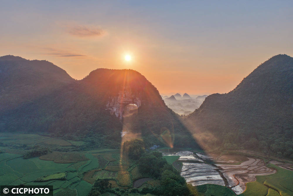 ↑2025年7月26日在湖南省永州市道县月岩风景区拍摄的晨景。(无人机照片)CICPHOTO/蒋克青 摄编辑:马兰