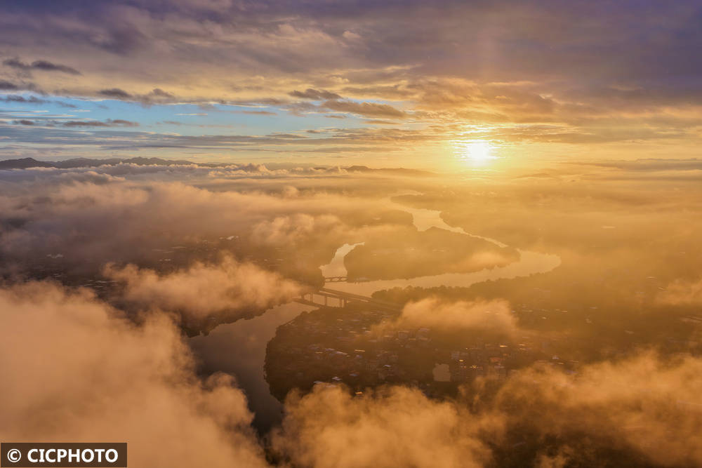 ↑2025年8月19日在湖南省永州市道县城区拍摄的晨景。(无人机照片)CICPHOTO/蒋克青 摄