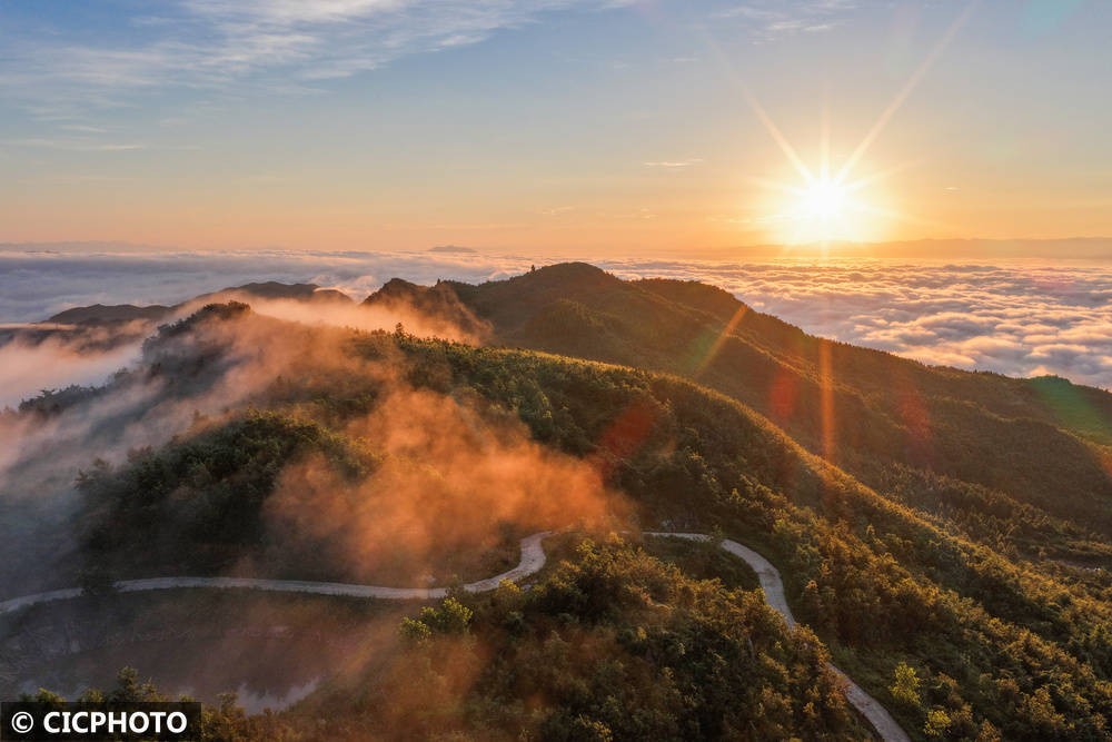 ↑2025年8月16日在湖南省怀化市辰溪县仙人岩国有林场拍摄的晨景。(无人机照片)CICPHOTO/米建华 摄