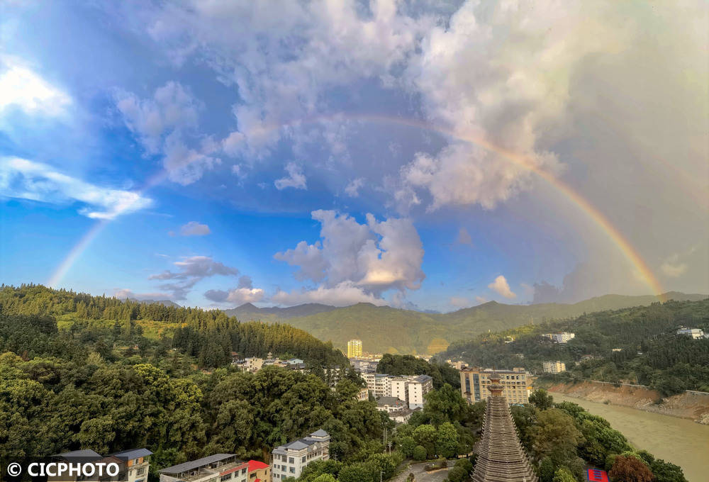 ↑2025年8月17日在贵州省从江县城区拍摄的彩虹。(手机照片)CICPHOTO/吴德军 摄