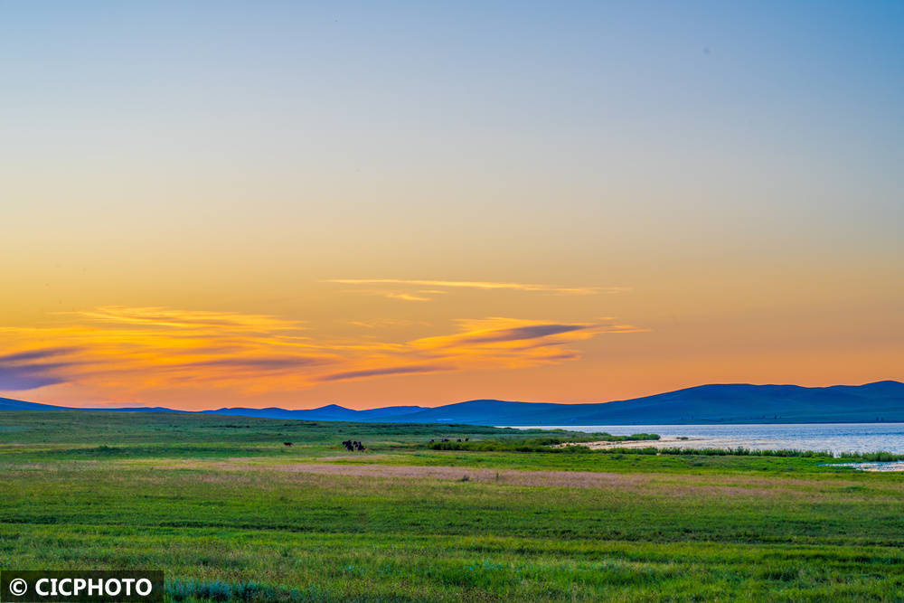 ↑2025年8月20日傍晚在内蒙古锡林郭勒盟乌拉盖湖拍摄的景色。CICPHOTO/牟超 摄