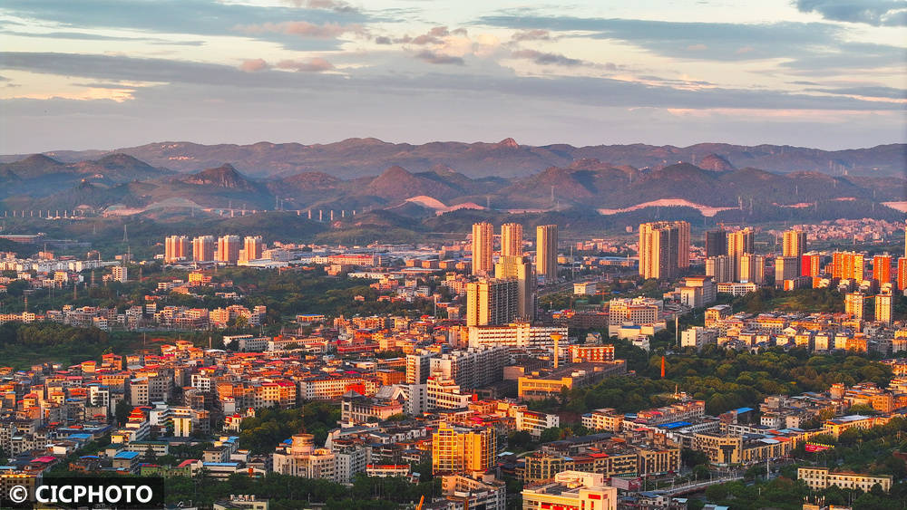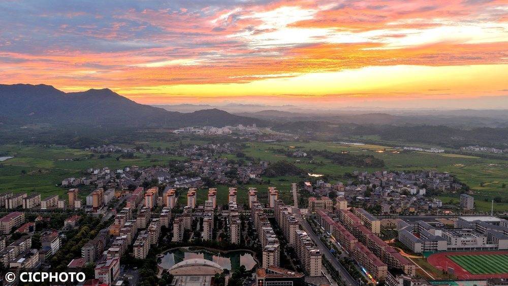 ↑2025年8月20日在湖南省永州市新田县城区拍摄的晨景。(无人机照片)CICPHOTO/刘贵雄 摄
