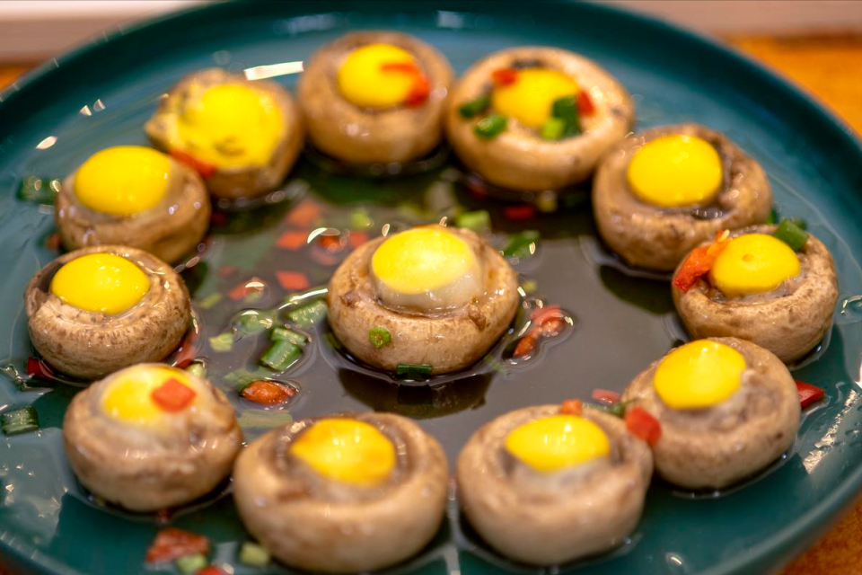 口蘑洗净去蒂,凹槽朝上放入空气炸锅,每个凹槽打一个鹌鹑蛋或填入蛋液,180℃烤10分钟,直到蘑菇变软、汁水渗出。这种做法最能保留口蘑的鲜味和营养。