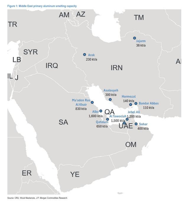 从地理位置角度,摩根大通认为阿曼Sohar冶炼厂(年产能约40万吨)和Ma'aden冶炼厂(年产能约84万吨)目前受冲击相对较小——Sohar港口位于阿曼湾,货运无需经过霍尔木兹海峡;Ma'aden则凭借一体化供应链维持生产。但这仍意味着巴林和阿联酋合计约430万吨/年的产能,以及伊朗约60万吨/年的产能处于高风险状态。一旦上述约560万吨/年的产能全部被迫停产,每月将有逾46万吨原铝退出市场。