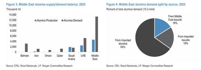 从供应链脆弱性来看,中东氧化铝自给率极为有限。摩根大通数据显示,中东氧化铝产量约460万吨,仅能覆盖当地铝消费所需氧化铝的约35%,且65%的氧化铝需求依赖进口。仅沙特阿拉伯马登(Ma'aden)具备完整的一体化供应链;EGA旗下的Al Taweelah氧化铝精炼厂也只能满足其不足一半的氧化铝需求,且仍依赖进口铝土矿。