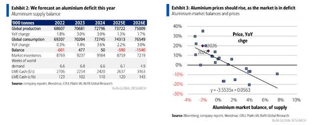 美银证券Michael Widmer团队在5日的报告中同步将2026年铝市供应缺口预测从100万吨上调至150万吨,并看涨铝价于2027年二季度触及4000美元/吨峰值。此时LME铝库存已近乎告罄,且逾半数剩余库存为俄罗斯铝锭,并非西方消费者的首选品类,可用缓冲极为有限。