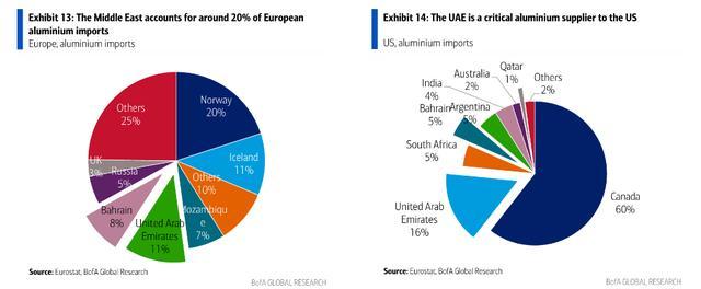 供应冲击将以最直接的方式传导至欧洲和美国,因为两者均高度依赖中东铝进口。据美银,中东约占欧洲铝进口的20%,其中阿联酋贡献约11%,巴林贡献约8%;阿联酋同样是美国最重要的原铝进口来源地之一。