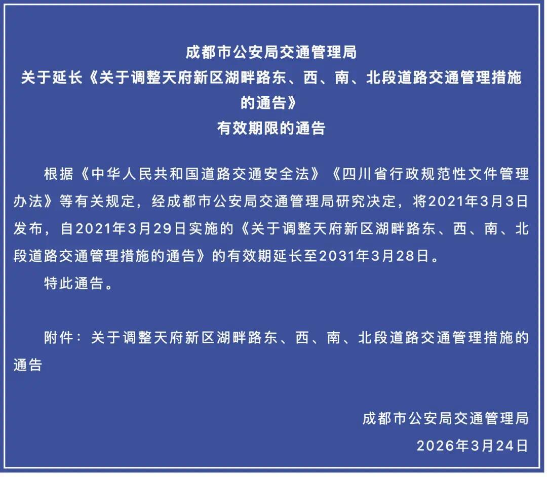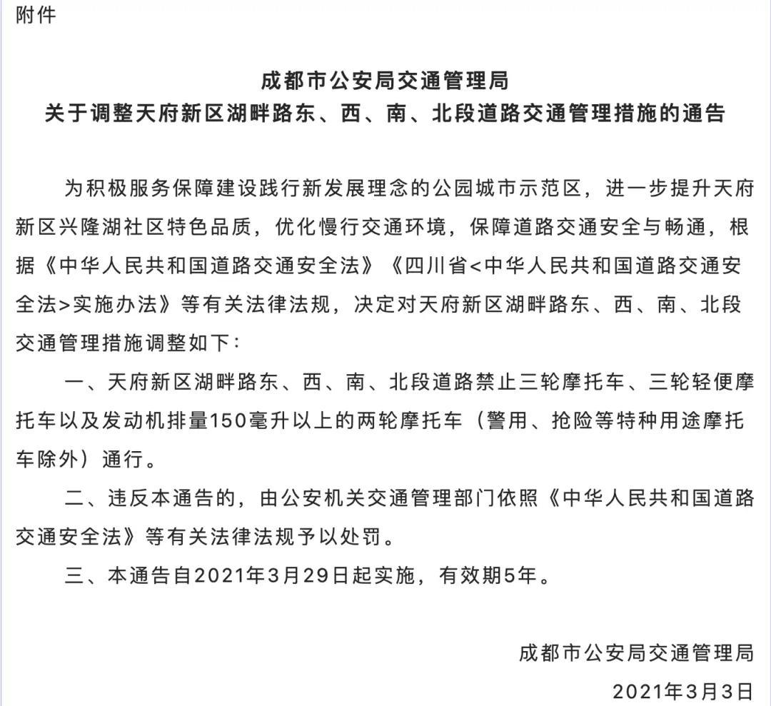 3月25日专业配资开户服务,成都交警发布通告:2021年3月29日起实施的《关于调整天府新区湖畔路东、西、南、北段道路交通管理措施的通告》,有效期延长至2031年3月28日。限行措施保持不变:禁止三轮摩托车、150毫升以上两轮摩托车通行(警用、抢险等特种摩托车除外)。