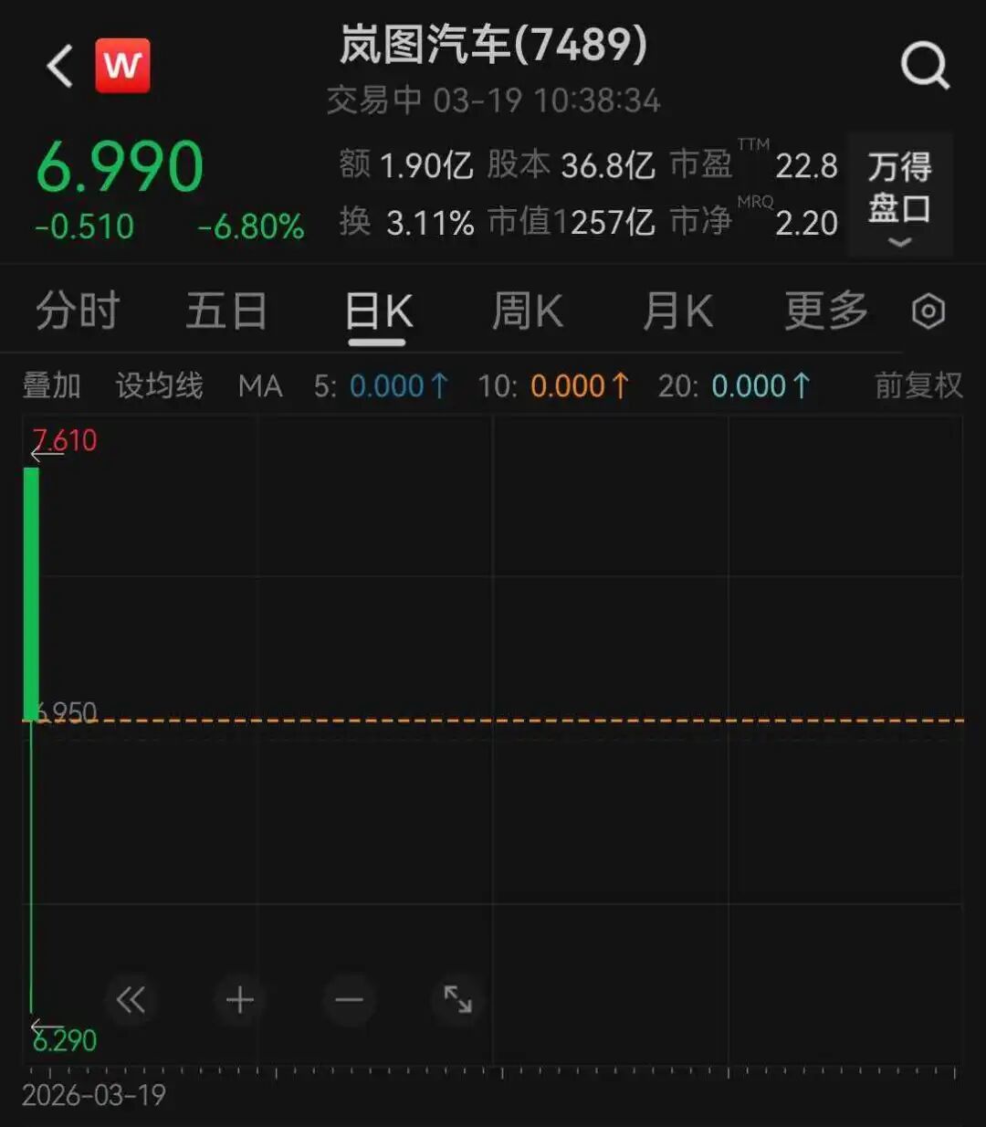 今日开盘后,岚图汽车股价一路下行,盘中最低价跌至6.4港元/股,跌幅超14%,随后拉升,截至发稿,跌6.80%。